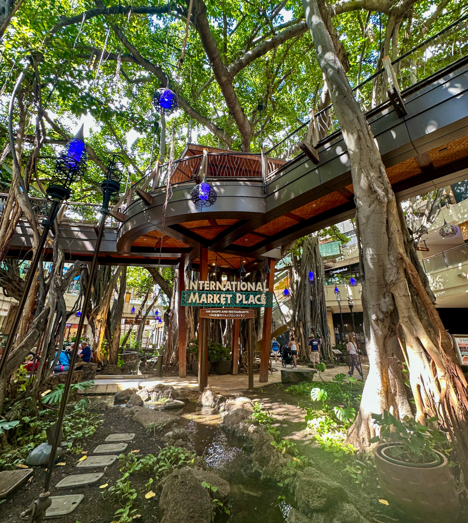 Located in the heart of Waikiki, the International Marketplace is an open air shopping center that celebrates the culture of Waikiki and its people. The center features over 90 stores and has an innovative design throughout, which includes clever water features and rustic Hawaiian landscaping, including a 160 year old Banyan tree.