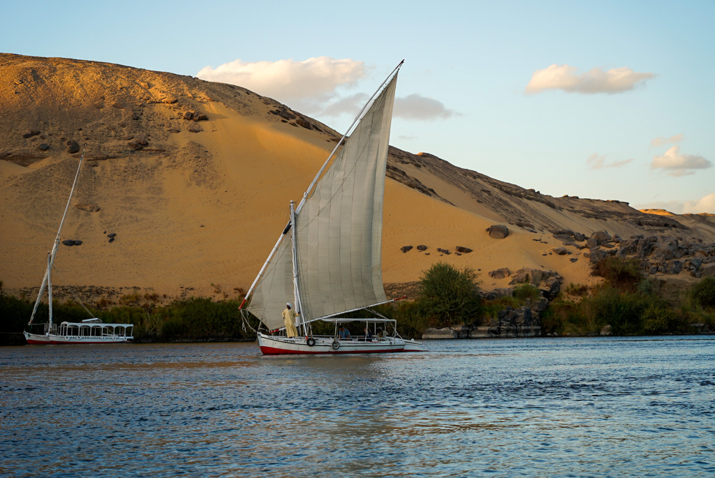 One of the best ways to experience the Nile is to take a ride on an authentic felucca boat. This is a traditional wooden sailboat with two lantern sails used to navigate.