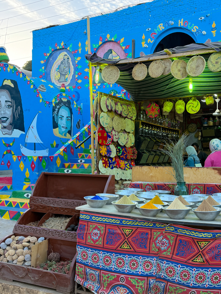 Next up, we explored the Nubian Village after a relaxed felucca ride along the Nile. The Nubian Village is a colorful community on the west bank of the Nile and one of the best places to explore a different side of Egypt. The Nubian people have lived along the Nile for thousands of years and have their own language and traditions. The first thing you notice is the brightly painted homes and vibrant artwork on the walls.