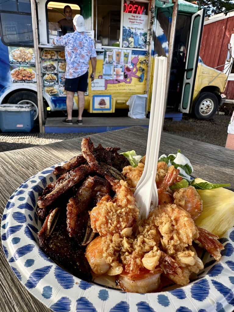 Northern Oahu is known for their food trucks. Only a quick, 10 minute drive from Laniakea beach will take you to some of the best. One of my favorites is Big Wave Shrimp Truck. The food is amazing and they give generous amounts for a great price. The combo plate of ribs and garlic shrimp was only 20 dollars. If seafood isn’t what you’re craving, there are various neighboring food trucks offering a range of food types including Mexican, American, and Korean cuisines.