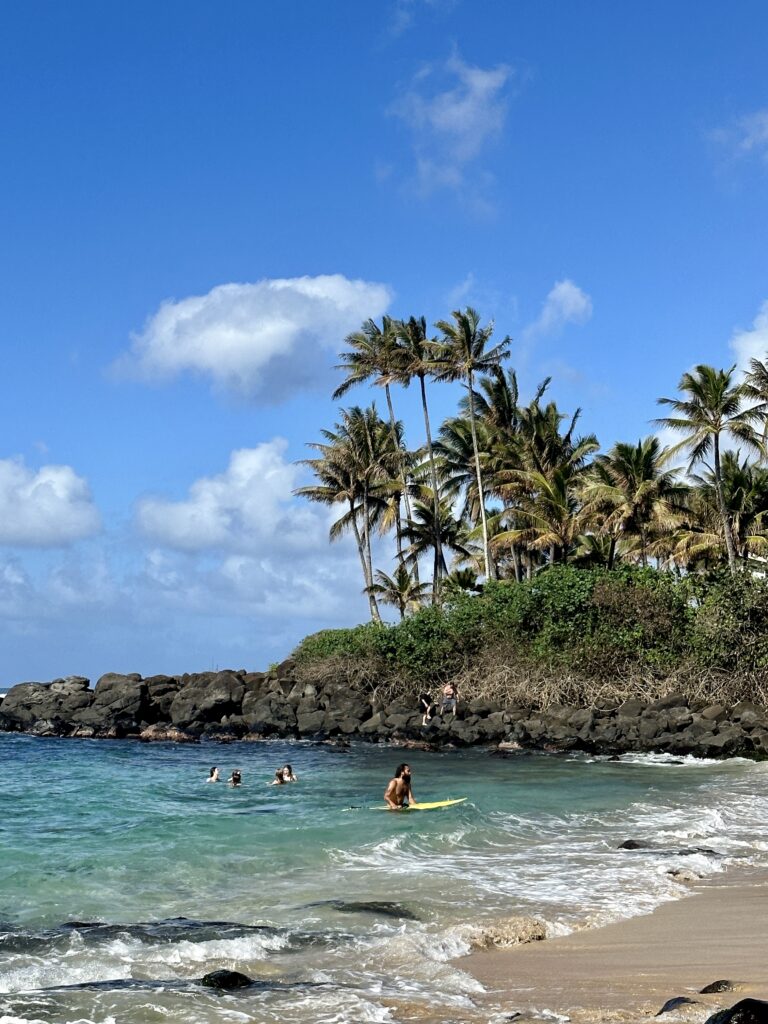 At the far right of the beach, there is a small area suitable for swimming. The waves here are less harsh and it is a good place to snorkel and see colorful fish. The chance to spot a sea turtle swimming in the water make the trip out to Laniakea beach totally worth it!