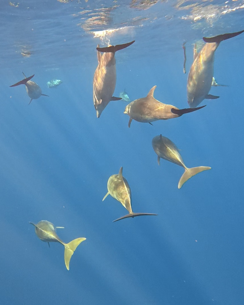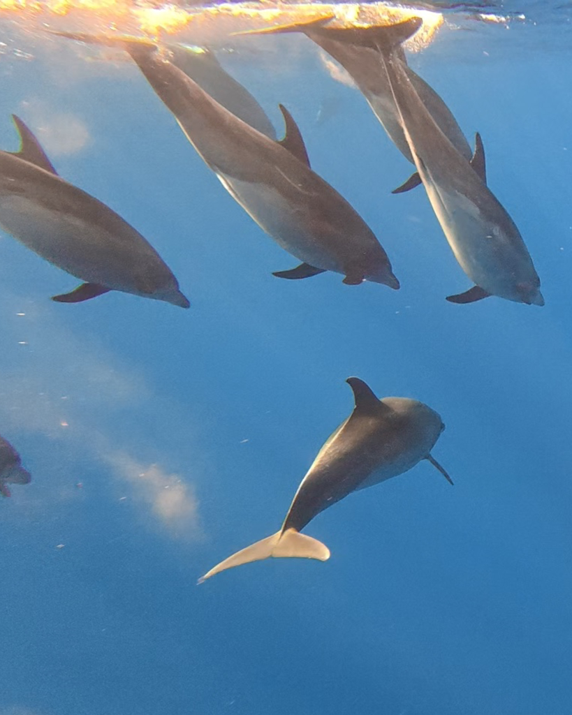For a closer view of the dolphins, getting in the water with them is your best bet. All gear is provided for snorkeling, and when the time comes, you will get into the water from the back of the boat, along with a crew member, and look down to see the dolphin pod gliding beneath you. In our experience, we were the only 2 people in our group (out of six total) who got in the water, so the crew was able to focus on us when it came to getting photos and videos of us in the water. We were lucky to spot a few humpback whales on our excursion, and the crew were able to use an underwater microphone to pick up their songs, which was fascinating to hear.