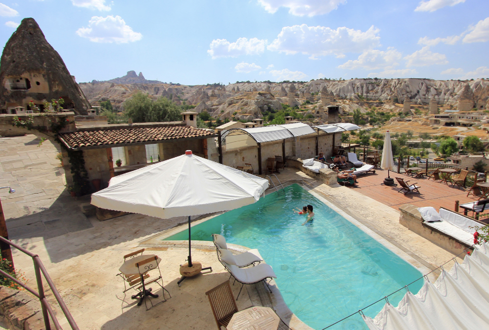 Despite being a budget friendly option, this hotel offers all the luxuries of higher priced options such as a pool and hot tub, comfortable rooms, a complimentary breakfast, and a terrace with great views of hot air balloons at sunrise. This hotel is also centrally located in Goreme and is walkable to amazing restaurants and shop.