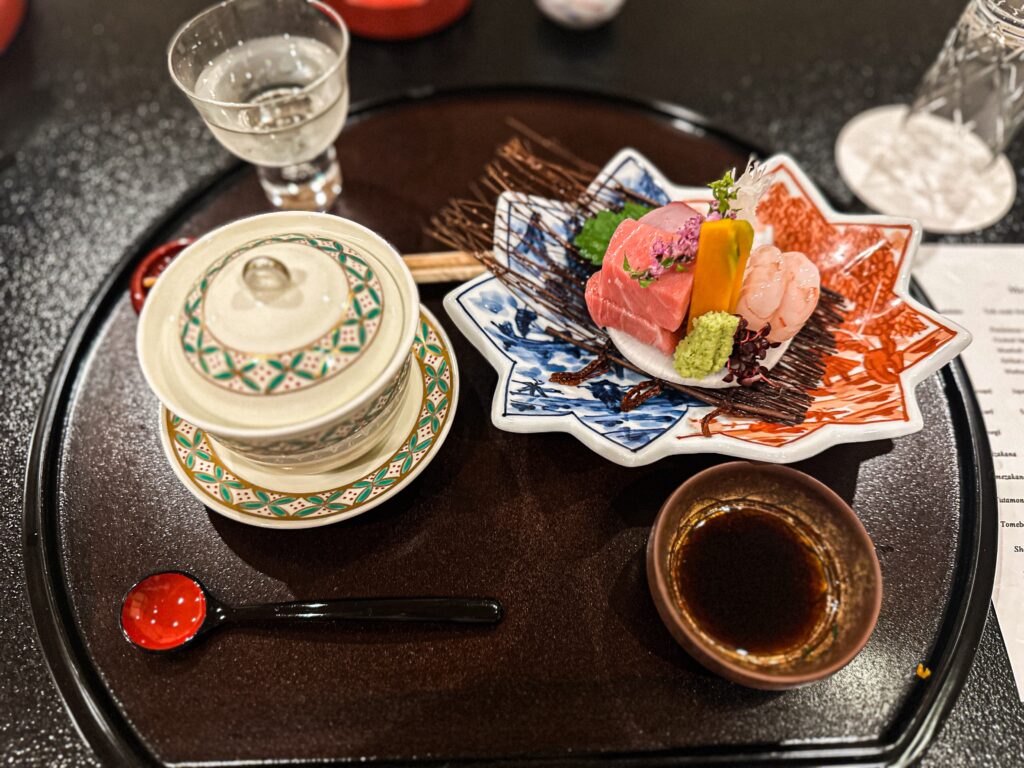 The dinner that was served to us was an “8-course meal” (however, each course had several dishes) with each dish being brought to us in the dining area of our own room. We sat at the table in a spacious room with traditional tatami mats on the floor and, along with wearing the kimono’s, we felt we were getting a true Japanese welcome.
